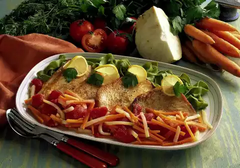 Heat the oil and fry the meat until golden brown. Arrange meat with noodles and vegetables. Serve garnished with parsley and lemon slices.