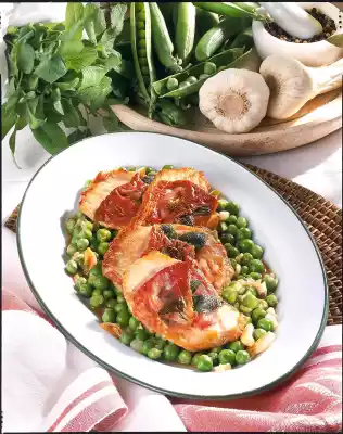 Peas peel, wash and drain. Wash the sage and drain well. Peel onion and garlic. Dice onion, halve garlic. Cut ham slices crosswise in half