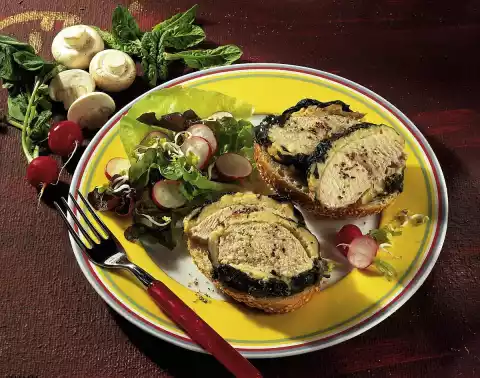 Place the fillet on top. Spread the rest of the mushroom filling on the fillet and place the remaining spinach leaves on top. Wrap with the pork net. Brown the roast in the remaining fat all around. First pour on 1/8 litre stock, cover and cook for 30-40 minutes. If necessary, add more stock in between. Cut the roast open and spread on the bun halves. Serve with mixed salad with radishes, sprouts and a clear vinaigrette