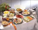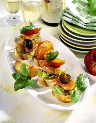 Add fruits and let it boil down for about 2 minutes at high heat. Cut baguette into slices. Wash salad leaves and pluck a little smaller. Cover baguette with salad and one medallion each. Then spoon 1-2 grapes or nectarine slices with sauce on each. Fasten with small wooden skewers. Garnish with basil as desired
