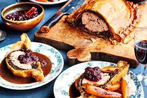 Roll out the 2nd pastry sheet, brush the edges of the pastry with whisked egg. Place on top and carefully bring into the shape of the roast. Press out air, squeeze edges of dough together. Trim edges to a width of 4 cm and twist, press and pinch with determination. Spread the dough with the rest of the egg. Bake in a hot oven for 50-60 minutes until the dough has risen and is golden brown and the meat has reached a core temperature of 70 °C. Let rest for 10 minutes, then cut open.