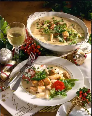 Then drain. Defrost the peas. Clean, wash and quarter the tomatoes, remove seeds and finely dice the flesh. Drain asparagus and cut into bite-sized pieces. Whisk egg yolk and remaining cream and alloy fricassee with it, do not boil anymore.