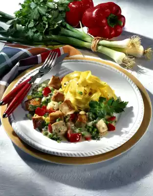 Add the peas halfway through the cooking time. In the meantime, put the noodles in boiling salted water and cook for about 10 minutes. Bring goulash to the boil again. Stir in the sauce thickener and season to taste with salt, pepper, sugar and lemon juice.