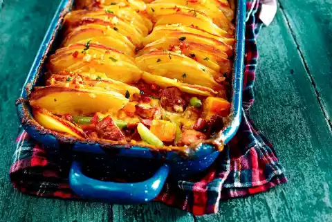 Season goulash to taste, stir in cream cheese and pour everything into an ovenproof dish. Place the potatoes close together almost vertically. Season with salt and sprinkle with butter. Bake in a hot oven (electric cooker: 200 °C/circulating air: 180 °C/gas: see manufacturer) for about 35 minutes. Wash and chop the thyme. Mix with crumbs and parmesan. Sprinkle on the potatoes and bake for another 10 minutes.