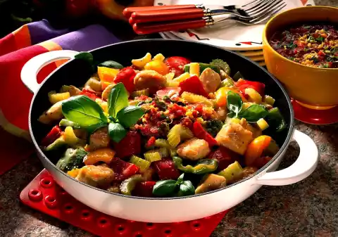 For the pesto, peel and finely chop the garlic. Wash the basil and dab dry. Put something aside for garnishing. Cut the rest into fine strips. Mix the chopped tomatoes, garlic, basil strips and lemon peel. Cover and leave to stand. Meanwhile wash the turkey, dab dry and dice. Clean, wash and chop the peppers. Celery also clean, wash and cut into small pieces. Heat the oil in a large pan. Sauté the meat in it while turning. Season with salt and pepper. Add vegetables. Also fry briefly. Deglaze with 1/2 litre water. Bring to the boil and cook over medium heat for about 10 minutes. Add sauce thickener, bring to the boil again. Season to taste with salt and pepper. Arrange the turkey pan garnished with the pesto and basil