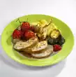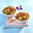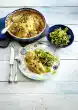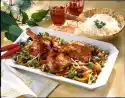 Melt the lard in the bacon fat. Fry the turkey meat for about 10 minutes at high heat, turning it over. Season with salt and pepper. Dust with flour. Add 3/4 litre water. Boil up briefly while stirring. Add juniper berries, bay leaves and prepared soup vegetables. Cover and stew for about 30 minutes. In the meantime, stir the powder for the dumplings into 3/4 litre of cold water and let it swell for 10 minutes. Form 12 dumplings from the dough with moistened hands. Put them into plenty of boiling salted water and let them simmer at low heat for about 20 minutes. Clean and wash spring onions and cut into thin rings.