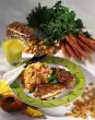 Cover and stew for about 30 minutes. In the meantime, stir the powder for the dumplings into 3/4 litre of cold water and let it swell for 10 minutes. Form 12 dumplings from the dough with moistened hands. Put them into plenty of boiling salted water and let them simmer at low heat for about 20 minutes. Clean and wash spring onions and cut into thin rings. Refine goulash with cream, season again. Fold in spring onions, diced bacon and onion. Serve dumplings and goulash garnished with parsley