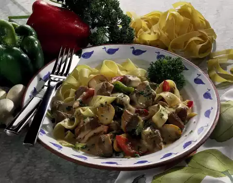 Cook the pasta in plenty of boiling salted water for 8-10 minutes until al dente. Stir sour cream into the goulash, bring to the boil and sprinkle in sauce thickener. Bring to the boil again. Season to taste with salt and pepper.