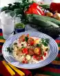 Rinse meat cold and dab dry. Cut into cubes and fry them all around in hot oil. Season with salt and pepper. Peel and finely dice the onion. Clean, wash and chop the peppers.