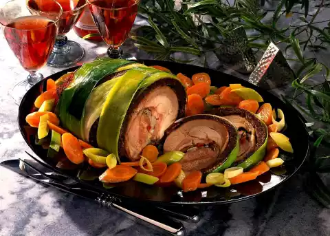 Sauté the prepared vegetables in it. Season with salt, pepper and sugar. Deglaze with broth and stew covered for 15 minutes. Take the roast out of the oven. Let it rest for five minutes. Carefully remove the foil and cut into slices. Arrange on a plate together with the vegetables