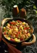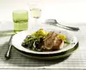 Spread the legs with the seasoning oil, place on the grill and slide over the vegetables. Fry everything for 1-1 1/4 hours. After about 30 minutes add 200 ml of water and stock. Turn the vegetables from time to time