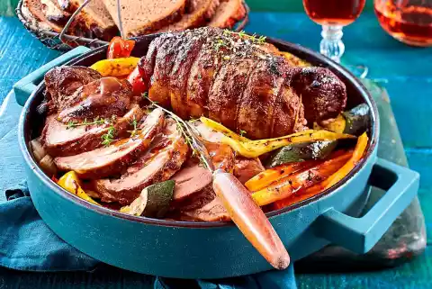 Remove meat from the marinade, dab dry and tie into shape with kitchen string. Season with salt and pepper. Mix paprika powder with 2 tablespoons of oil. Brush the roast all around with it. Slide the meat on the oven rack directly above the fat pan with the vegetables into the preheated oven (electric cooker: 200 °C/circulating air: 180 °C/gas: see manufacturer) and cook for 1 1⁄2 -1 3⁄4 hours. Arrange everything. Farmhouse bread tastes good with it.