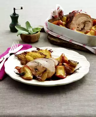 Wash apples, dab dry, quarter and core them. After about half of the frying time add apples, mix into the vegetables and braise. Mix the remaining chilli and honey. 15-20 minutes before the end of the cooking time, brush the turkey leg with the chilli-honey mixture