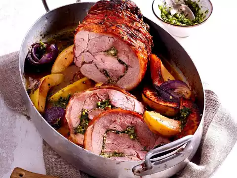 Add the quinces and onions to the roaster about 30 minutes before the end of the roasting time and finish cooking without the lid. Take the roaster out of the oven, cut the meat into slices and serve. Add the remaining pesto.