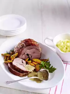 Drain the potatoes and let them evaporate briefly. Add milk and 2 tablespoons of butter and mash to a puree, season with salt and nutmeg. Remove the roast from the roaster and put aside covered. Bring the stock to the boil once, stir in honey and sour cream. Season to taste with salt and pepper. Mix parsley with the carrots and season again. Serve roast with sauce, mashed potatoes and carrots, garnish with parsley