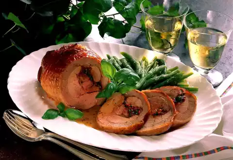 Spread the tomato mixture on the meat. Roll up meat firmly and pin it with wooden skewers. Wrap them tightly with kitchen string. Cook meat on the grid in the preheated oven (electric cooker: 200 °C/ gas: level 3) for approx. 1 1/2 hours. Push the fat pan underneath. Clean, wash and roughly dice the soup vegetables. Put them on the fat pan. Gradually pour 1/2 litre of water over the roast. In the meantime clean, wash and halve the beans. Cook in boiling salted water for about 15 minutes. Swivel in hot fat before serving. Remove meat from the oven. Pour the roast stock through a sieve.