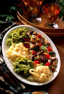 Carefully place the pasta nests in plenty of boiling salted water and cook for 12-15 minutes. Then drain and allow to drain. Meanwhile wash the liver, dab dry and dice. Wash spring onions, mushrooms and cherry tomatoes,
