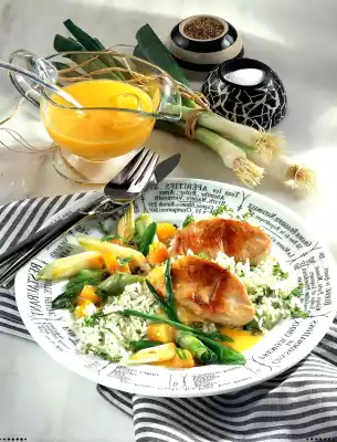 Season to taste with salt and pepper. Wash and chop the parsley and mix it with the rice. Arrange two medallions each with vegetables and rice on a plate.