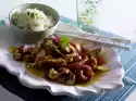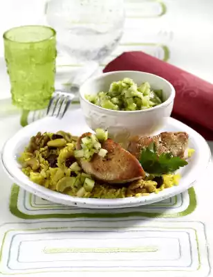 Wash the meat, dab dry. Heat 2 tablespoons of oil in a large frying pan. Fry the medallions for 3-4 minutes on each side. Season with salt and pepper. Season cucumber salsa to taste again. Arrange medallions, curried rice and salsa.