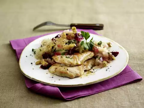 Wash the turkey medallions and pat them dry. Heat rapeseed oil in a pan. Fry the medallions for 3-4 minutes on each side. Season with salt and pepper. Season sauerkraut salad again and arrange with the medallions.