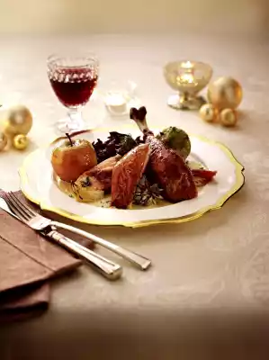 Arrange turkey with braised vegetables, apple and cream stock on a plate. Garnish with thyme if desired. Arrange dumplings in bowls, sprinkle with remaining parsley. Red cabbage tastes good with it