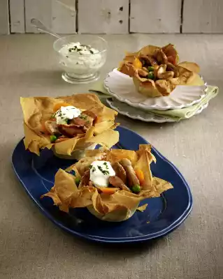 Melt butter in a small pot, add 2 tablespoons of milk. Brush dough sheets thinly with the butter mix and cut into 4 squares. Place 3 squares on top of each other, staggered. Grease 8 hollows of the muffin tray and line the hollows with the dough squares