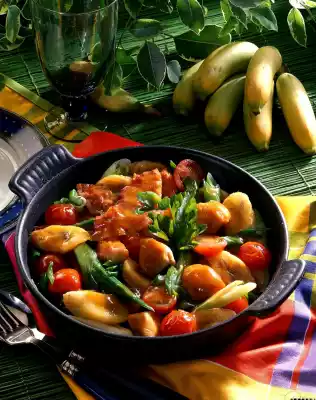 Bring to the boil, stir in the sauce thickener and bring to the boil again briefly. Peel banana, cut into slices and fold in. Put bacon on the pan and garnish with parsley as desired.