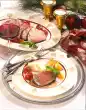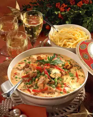 Deglaze with 3/4 litre water. Stew for about 20 minutes. Add crème fraîche, chanterelles, peppers and peas and cook for another 10 minutes. Whisk the cream and egg yolks and stir into the ragout. Do not let it boil any more! Season to taste again. Serve sprinkled with parsley and garnished. Butter noodles taste good with it