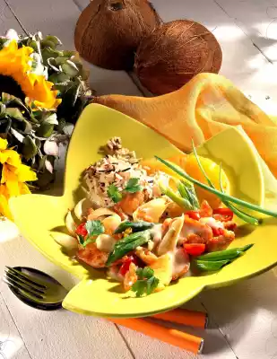 Sauté the spring onions and onion in hot frying fat. Add the tomatoes and the whole pineapple, steam briefly