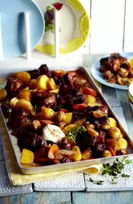 Place all the prepared ingredients in a large bowl. Add honey, paprika powder and oil. Season with salt and pepper and mix everything well. Then spread on the fat pan of the oven and pour 200 ml of water.