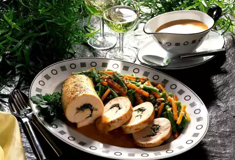 Melt the fat shortly before serving. Add vegetables, nuts and parsley. For the turkey roulade, clean, wash and roughly dice the soup greens. During the last 20 minutes add to the fat pan. Deglaze with 1/2 litre water. Remove the turkey roast from the fat pan and keep warm. Pour roast stock through a sieve. Stir in crème fraiche. Bring to the boil briefly, add sauce thickener, bring to the boil again. Season with salt and pepper. Cut the roast open, arrange on a plate with some sauce and the vegetables. Garnish with parsley. The rest of the sauce extra is enough