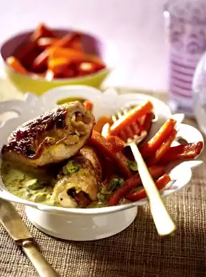 Heat 2 tablespoons of oil in a frying pan and fry the turkey rolls for about 10 minutes, turning them over. Meanwhile heat 1 tbsp. butter, dust with flour and 1 tbsp. curry powder and sauté for 2-3 minutes. Add spring onion green and fry for another 1 minute. Deglaze with stock and coconut milk, bring to the boil and simmer for about 6 minutes. Season to taste with salt, pepper, lemon juice and jam. Arrange carrot fries and turkey rolls