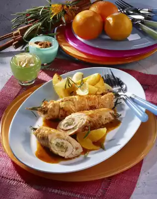 Cover each cutlet with a sprig of rosemary, roll up and pin with toothpicks. Heat the remaining oil and fry the turkey rolls all around. Deglaze with orange juice, except for 2 tablespoons, and chicken stock, season with cinnamon and boil down. Mix the starch with the remaining orange juice and thicken the sauce with it. Arrange rolls with potatoes and onions. Serve sprinkled with rosemary needles