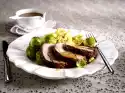 Spread the cutlets with the filling and roll them up. Tighten. Fry in 2 tablespoons of hot oil. Deglaze with milk and broth and braise covered for about 15 minutes
