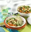 After 15 minutes add carrots and zucchini to the rice and cook. Stir the sauce thickener into the sauce and cook for about 2 minutes. Drain the rice. Cut the rolls into slices and arrange on plates with sauce and rice.
