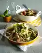 In the meantime, cook the noodles in boiling salted water for 12-15 minutes. Deglaze turkey rolls with chicken soup and wine and cook for another 10 minutes. In the meantime, clean, wash, quarter and seed the tomatoes. Cut into large cubes. Drain the noodles. Heat the remaining fat in a pan and briefly sauté the tomato pieces in it. Add the noodles and mix. Remove the turkey rolls and keep warm. Stir crème fraiche into the stock and bring to the boil.