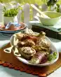 Add 8 tablespoons of water, bring to the boil, cover and simmer over a low heat for 10-15 minutes. Peel the carrots and leave some green. Clean and wash the mangetouts. Steam vegetables in a little salted water for about 5 minutes in a closed pot.