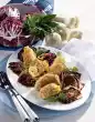 Pour sauce through a sieve, bring to the boil again and thicken with sauce thickener. Spätzle are delicious with it.