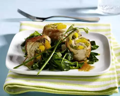 After 2 minutes add the spinach and season with salt, pepper and nutmeg. Arrange spinach and turkey rolls on plates. Garnish with chives.