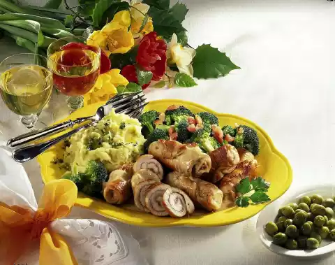 Clean and wash the broccoli and cut into florets. Steam in little boiling salted water for about 8 minutes. Scald tomatoes with boiling water, rinse under cold water and peel the skin. Cut tomatoes in half, remove seeds and cut into cubes. Heat butter in a pot, add tomatoes and toss the drained broccoli in it. Keep warm. Pour cream into the turkey rolls, sprinkle with sauce thickener and bring to the boil again briefly. Season to taste with salt and pepper. Drain the potatoes and collect approx. 150 ml of potato water and add again. Add olive puree and milk and mash the potatoes. Flavour with salt and pepper. Arrange turkey rolls, broccoli and mashed potatoes and olives on a large plate. Drizzle 1-2 tablespoons of olive oil over the puree and sprinkle with the parsley mixture. Serve garnished with parsley