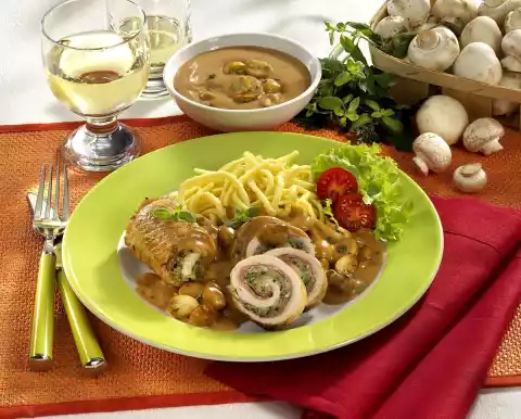 Sauté the mushrooms in the hot frying fat. Add 100 ml water and cream, stir in the contents of the bag and simmer for 5 minutes. Drain the pasta and let it drain. Serve turkey rolls with sauce and noodles.