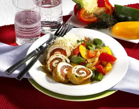 Heat 1 teaspoon of oil in a frying pan. Brown the turkey rolls all around. Add stock and cook covered for about 15 minutes. Prepare rice in boiling salted water according to package instructions. Cut the remaining peppers into small pieces.