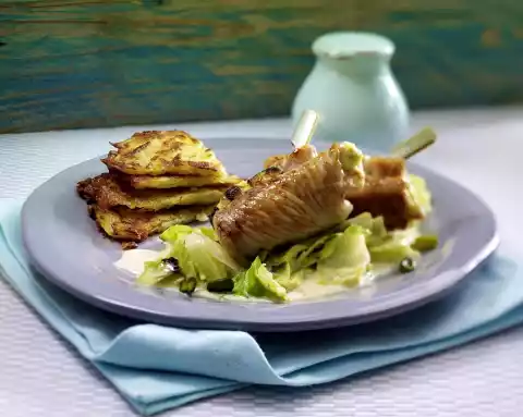 Turn the Rösti halfway through the frying time. Keep the finished Rösti warm. Fry the remaining 12 Rösti in the same way. Wash the meat, dab dry, cut in half lengthways and season with salt and pepper. Spread 1 teaspoon of cheese on each roulade and smooth it down.