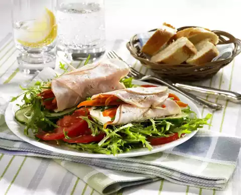 Mix salad ingredients and marinade. Arrange with the rolls in portions. Grind a little fresh pepper on top. Delicious with baguette bread.