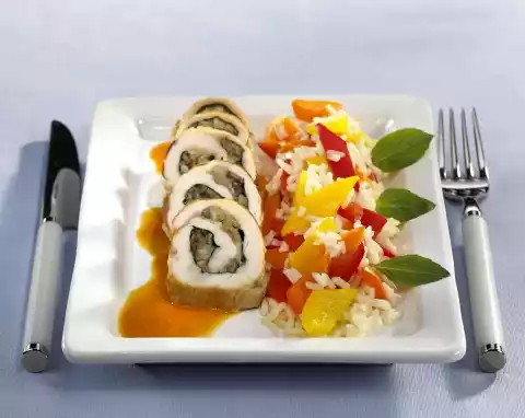 Cook rice in boiling salted water for about 20 minutes. Season turkey escalopes with salt and pepper, cover with bacon slices. Wash the basil, dab dry and pluck the leaves from the stalks. Cover the escalopes with the leaves. Spread the mushroom filling on the leaves. Roll up the turkey escalopes and pin them with wooden skewers. Quarter the peppers, clean, wash and cut into rhombuses. Heat 1 tablespoon of olive oil in a saucepan, sauté the peppers in it, add vegetable stock and cook for about 5 minutes. Heat 1 tablespoon of olive oil in a pan. Brown the turkey rolls all around. Cook for 10-12 minutes at medium heat. Drain the rice.