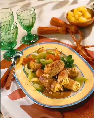 Season with salt and colored pepper. Deglaze with broth and cook on low heat for 6-8 minutes. Remove the roulades from the pan and keep warm. Thicken stock with sauce thickener and bring to the boil again.