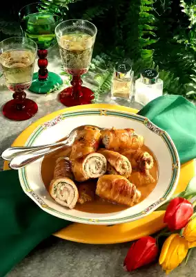 Briefly warm the roulades in the hot sauce. Arrange in a deep bowl and serve.