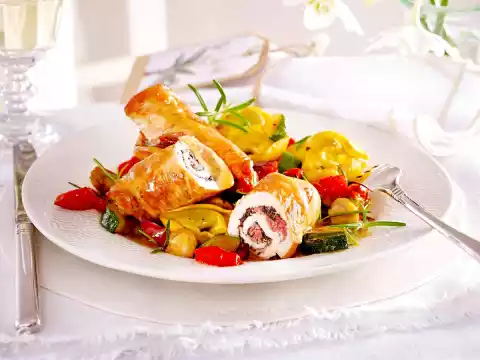 Remove the roulades from the stock, bring the stock to a boil. Stir starch and 2 tablespoons of water until smooth, stir in and simmer for 1 minute. Season to taste with salt, pepper and 1 pinch of sugar. Leave the roulades to stand briefly. Then serve with sauce and tortelloni vegetables.