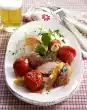Fold it up and pin it down. Fry for 6-8 minutes in hot frying fat while turning. Serve with tomato sauce and rice. Garnish with basil.