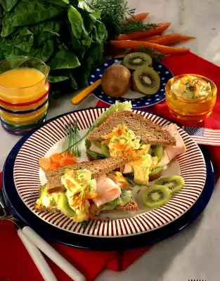 Peel and slice the kiwis. Spread slices of bread with butter. Cover four slices with a salad leaf, two slices of turkey breast and some slices of kiwi. Spread curry cream on top. Cover each with a second slice of bread